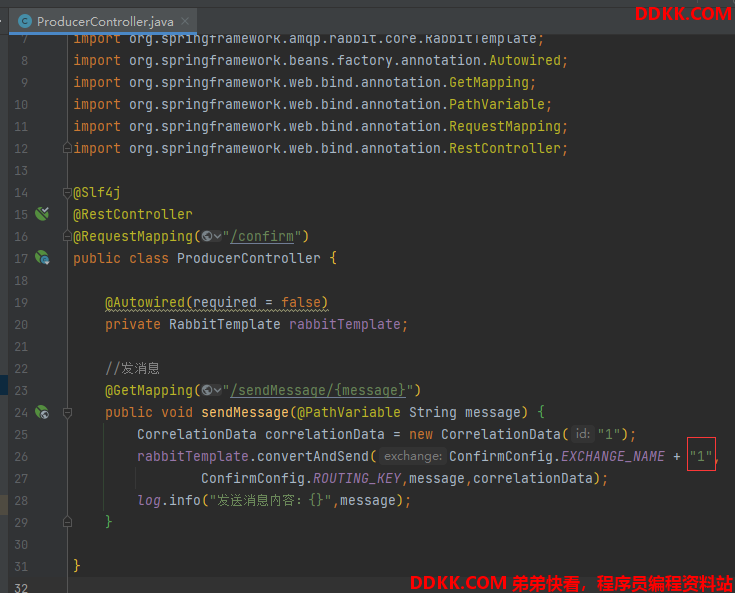 6、 在上述步骤可得知confirm方法有一个类型为CorrelationData的参数correlationData,这个参数实际上是空的,并没有值,需要生产者发送,correlationData参数才会有值(connfirm方法的其余两个参数ack和cause默认有值)所以我们需要修改生产者的代码;