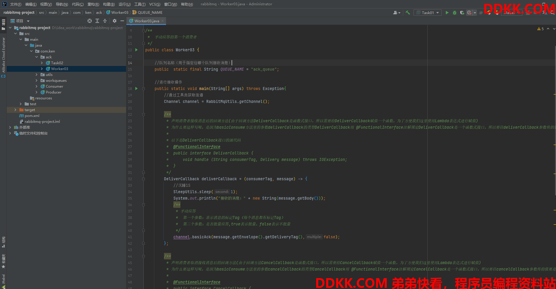 8、 新建一个名为Worker03的类,用作充当消费者一号,代码如下;