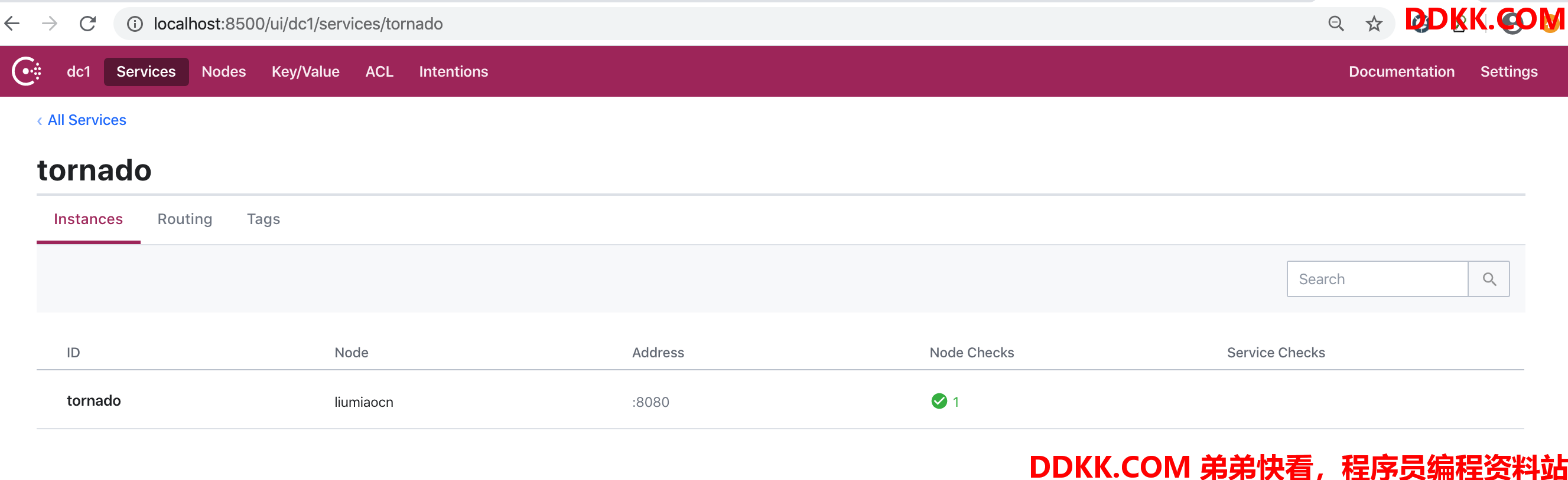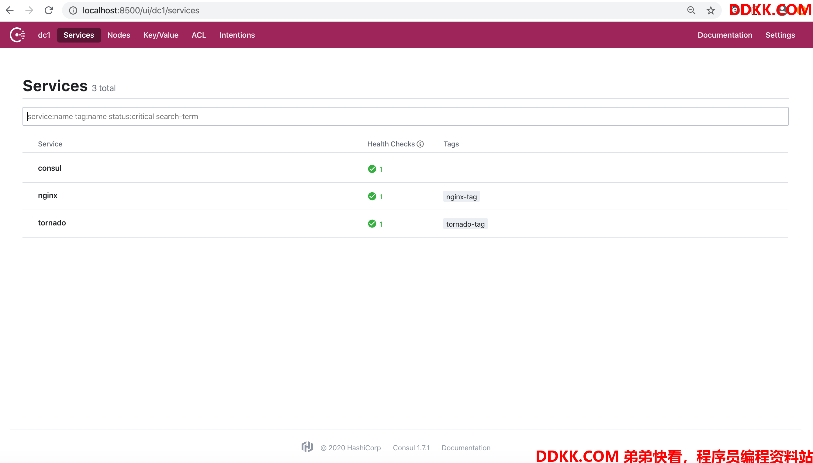 注意:本文示例中注册的服务还尚未启动,我们并没有事前在80端口启动一个nginx服务,在8080端口启动一个tornado服务,在Consul中可以注册尚未启动和运行的服务。