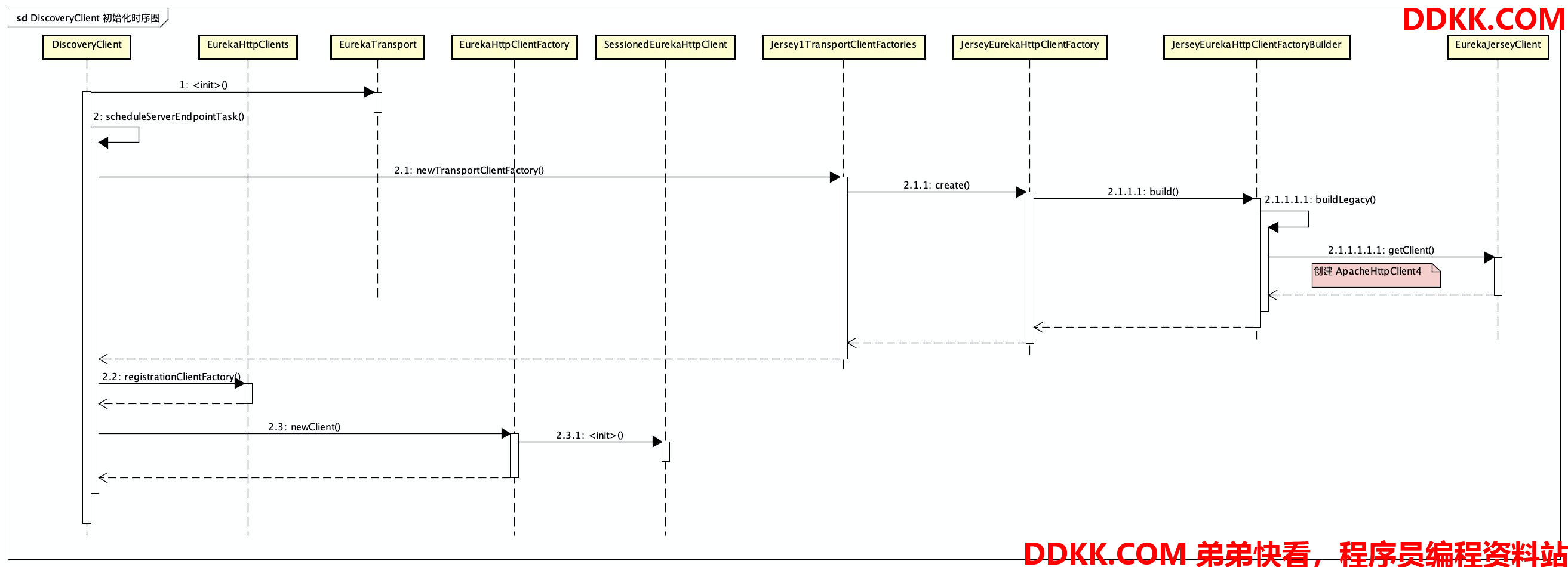 下面是EurekaClient 实例初始化远程调用 Eureka Server 所需要的 Http 调用的时序图。