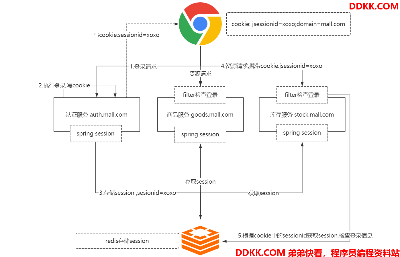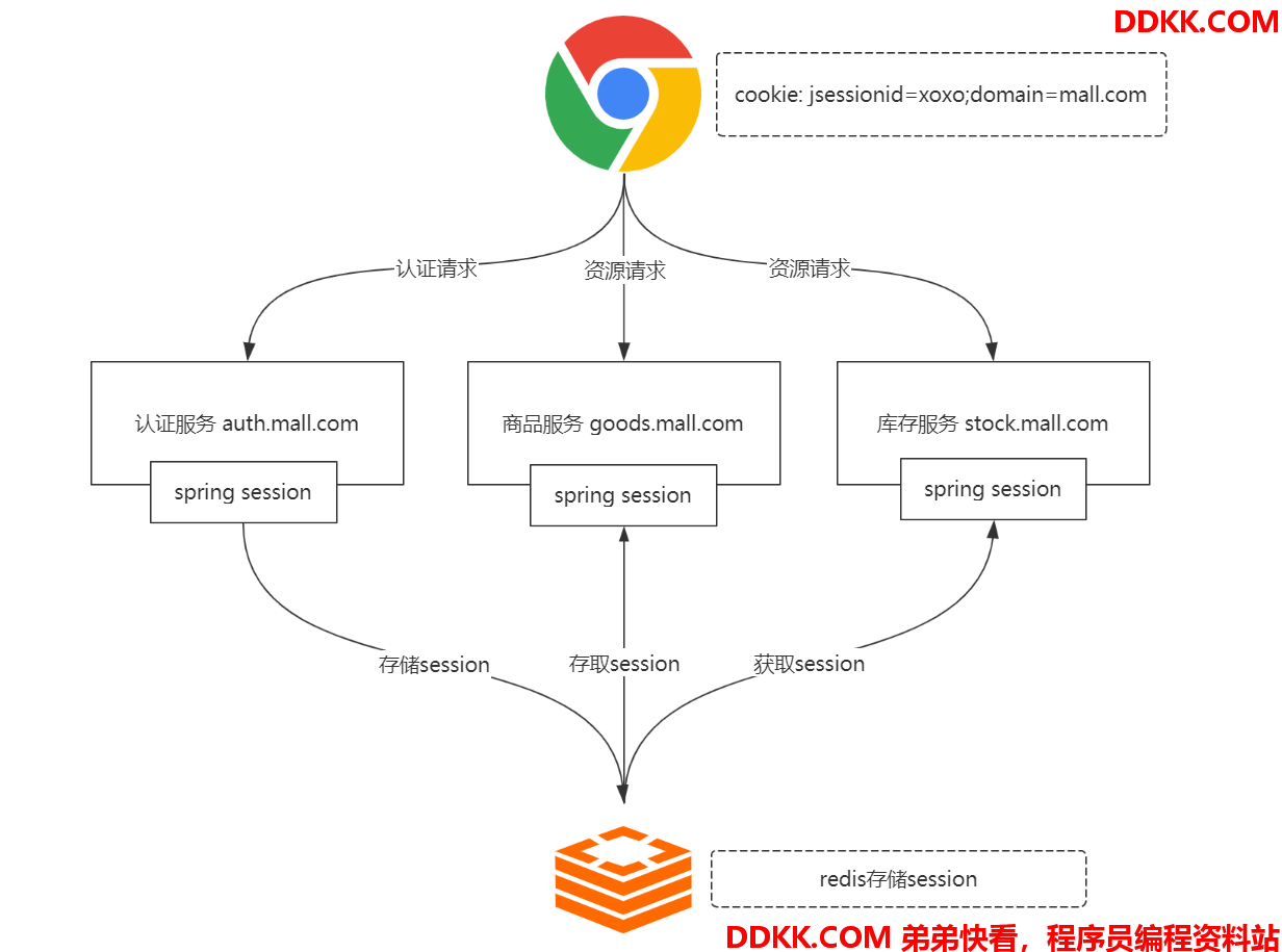 SpringSession干的工作就是修改getSession和setSession方法基于Redis存取Session,同时要注意的是Session是通过Cookie传递sessionid的,如果要让多个服务都能接受到sessionid拿到session,需要把cookie的存储域扩大,如有三个系统“auth.mall.com”,“goods.maill.com”,“stock.mall.com”,那我们需要把domian设置成“mall.com”,这样一来浏览器带着cookie请求任何一个系统都可以获取到sessionid,然后从Redis中获取Session。