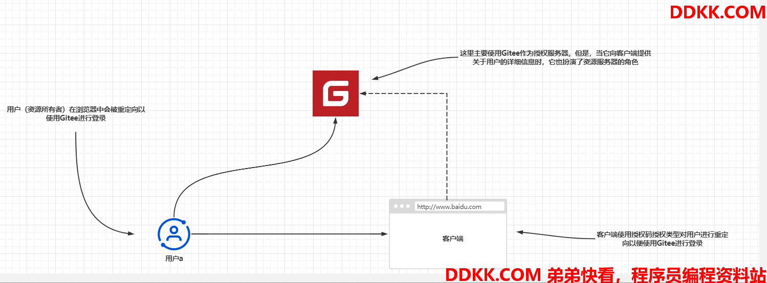在这个应用程序中,我们要使用Gitee作为授权和资源服务器,并重点关注使用授权码授权类型的组件之间的通信.在后面的学习中我们将在OAuth2架构中实现一个授权服务器和一个资源服务器。