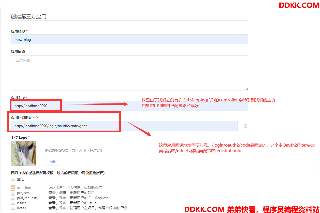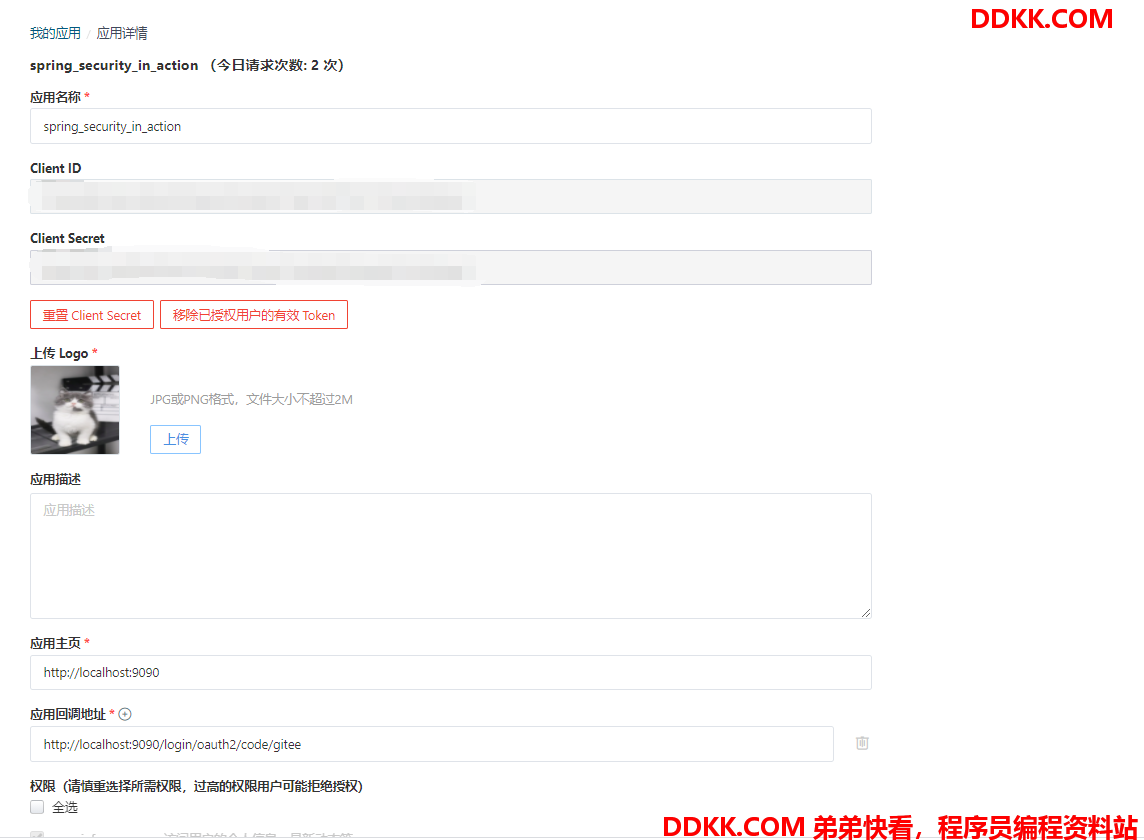 上图的“应用回调地址”就是我们注册的应用程序client(客户端)的接收授权码和access-token的地址其中,/login/oauth2/code必须是这样,这是由Client引入的oauth2AuthenticationFilter的内部默认路径。而后面的gitee是registrationid,与我们在自己的Client代码中配置的一致,Client的oauth2AuthenticationFilter要靠这个值去对应配置在程序中的clientid和clientSecret然后发给gitee认证服务器。且将来gitee授权服务器收到授权请求后,会将配置的这个应用回调地址与请求参数中的redirect_uri匹配,正确才回传授权码以及access_token。否则会报无效的回调地址(别问我为什么知道,问就是鸽那么多天都在尝试解决这个)