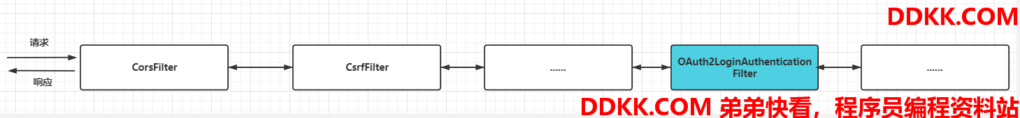 这里出现了一个新方法:oauth2Login(),但经过了之前的学习的你应该需要能反应过来其中进行了什么处理。与httpBasic()和formLogin()一样,oauth2Login()只是将一个新的身份验证过滤器添加到过滤器链中。我们之前说过SpringSecurity有一些过滤器实现,并且还可以向过滤器链添加自定义的过滤器。在本示例中,当调用oauthLogin()方法时,框架添加到过滤器链中的过滤器就是之前提到过的OAuth2LoginAuthenticationFilter.这个过滤器会拦截请求,并应用OAuth2身份验证所需的逻辑。
