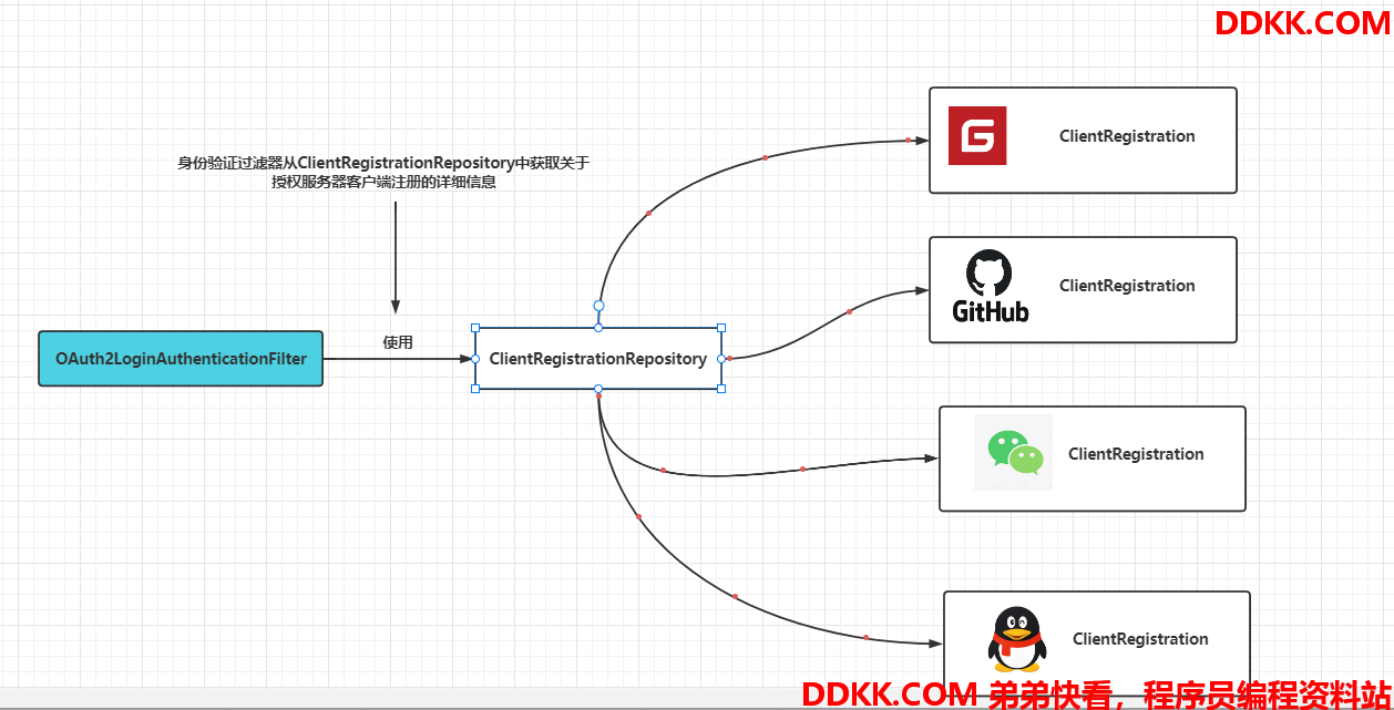 ClientRegistrationRepository会检索ClientRegistration详细信息(客户端ID、客户端密钥、URL、作用域等)。身份验证过滤器需要将这些详细信息用于身份验证流程。