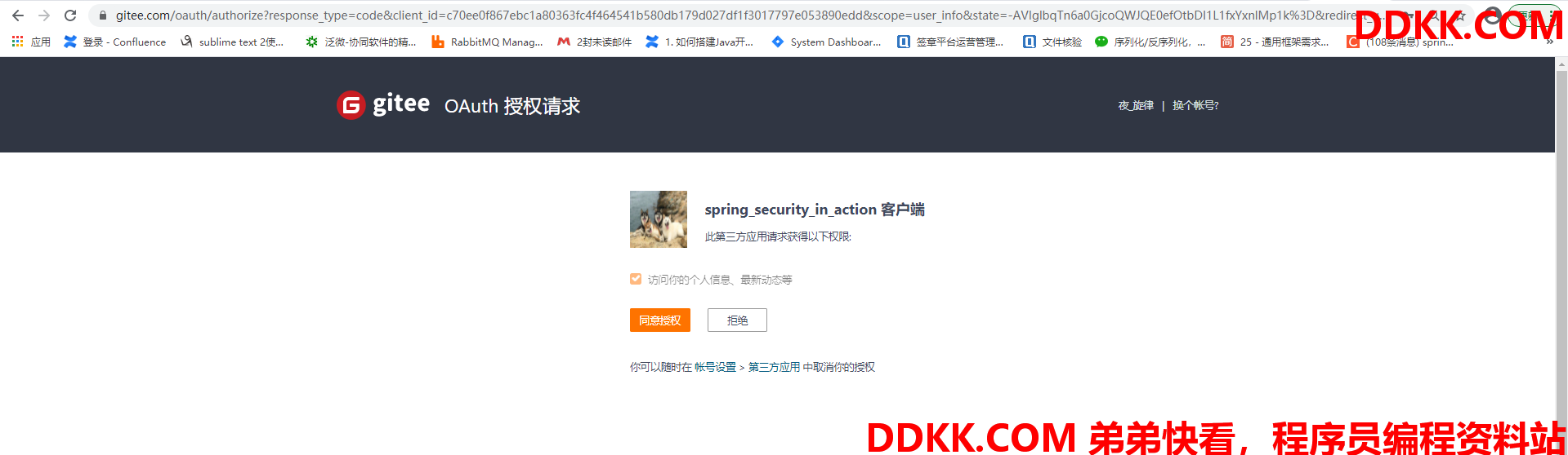 输入自己的gitee的账号密码后,客户端将我们重定向到gitee的授权页面,这个就是上图中的⑤-⑧步