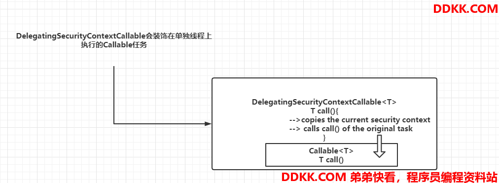 SpringContextHolder的无指定策略为我们提供了一个自管理线程的解决方案。在这种情况下,我们需要处理安全上下文转播。用于此目的的一种解决方案是使用DelegatingSecurityContext(Runn/Call)able装饰想要在单独线程上执行的任务。通过类的名字不难猜出它扩展了Runnable/Callable,区别只是一个不存在返回值一个存在返回值。这两个类都代表异步执行的任务,就像其他任何Runnable和Callable一样,它们会确保为执行任务的线程复制到当前安全上下文。如下图,DelegatingSecurityContextCallable被设计成Callable对象的装饰器。在构建此类对象时,需要提供应用程序异步执行的可调用任务,并将安全上下文复制到新线程,然后执行任务。