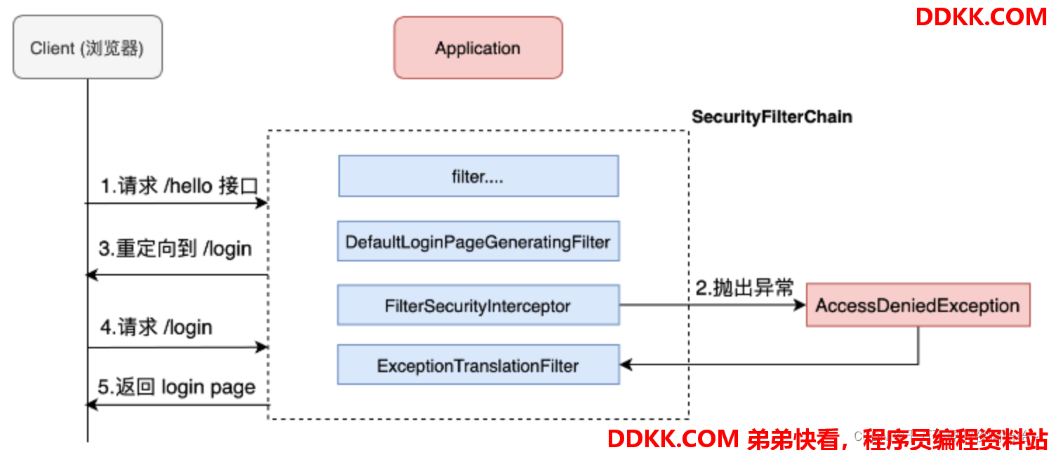 3. 抛出 AccessDeniedException 的异常会被 ExceptionTranslationFilter 捕获,这个 Filter 中会调用 LoginUrlAuthenticationEntryPoint#commence方法给客户端返回 302,要求客户端进行重定向到 /login ⻚面。