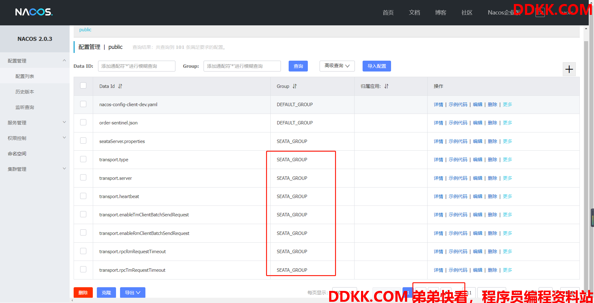 当以上的这些配置完成以后,我们就可以启动nacos和seata-server了,此时我们查看Nacos的配置中心,就会看到我们传入的所有配置信息